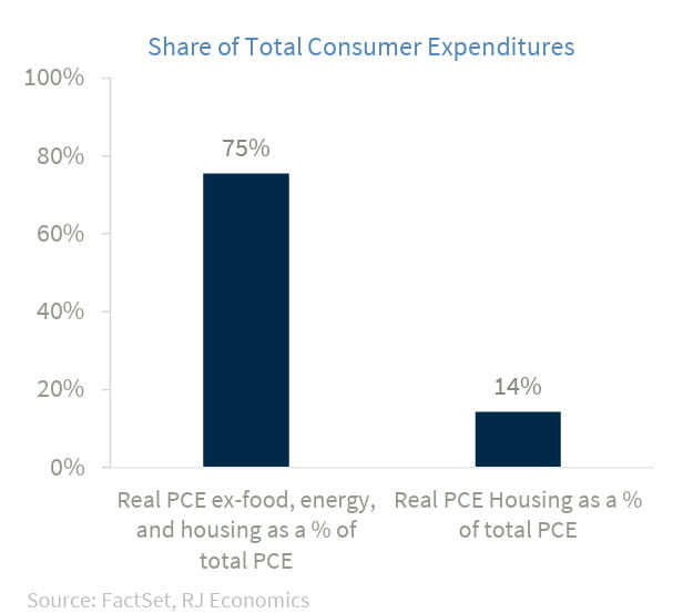 Third, although the pre-tariff disinflationary process is still alive and well, the risks for a sustained increase in inflation have increased, according to some of the members of the Fed. The next three graphs show why this may be the case. The first graph shows real personal consumption expenditures (PCE) segmented into two broad categories. The first category is real PCE excluding food, energy, and housing consumption as a percentage of total real PCE. The second category is real PCE in housing as a percentage of total real PCE. The first bar shows that real PCE excluding food, energy, and housing represents 75% of total PCE, while the second bar shows that real PCE in housing accounts for just 14% of total real PCE.