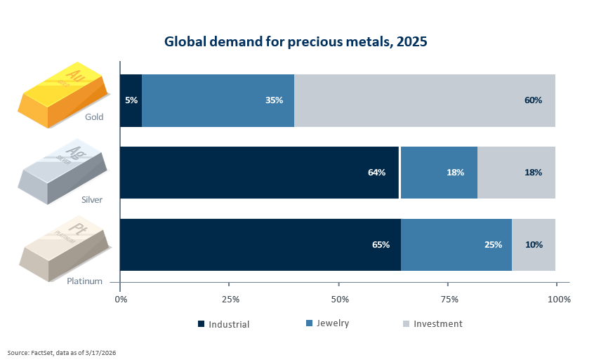 Industrial applications account for a mere 5% of global gold demand, whereas 60% represents gold as an investment (e.g., stockpiles in central bank vaults). The remaining portion is jewelry. The amount of gold mined around the world barely changes from year to year, so price volatility is largely a function of the level of investor appetite for owning gold. This appetite tends to increase in times of geopolitical turbulence and/or high inflation, but it is subject to abrupt reversals, sometimes for no apparent reason.